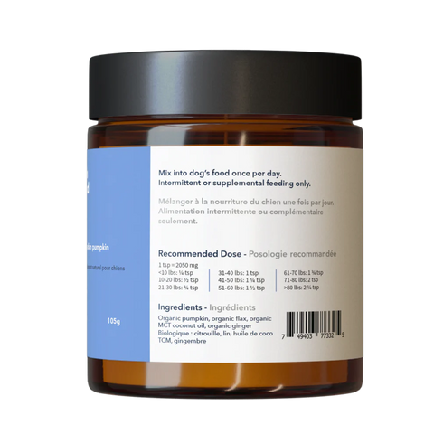 Pumpkin + may be the healthy, safe, and delicious way to help your dog's digestion. Mix our fiber-rich mixture in their food to add much-needed whole-food nutrition to their diet. Made with organic pumpkin, ground organic flax seeds, organic MCT oil, and organic ginger.